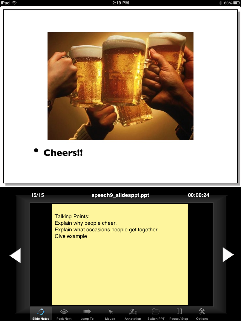 We looked into various applications such as those that use Remote VNC. They are nice and effective but also very slow. The connection is intermittent too. When I am presenting, I want my slides to move with me on real time. I want it to be like a clicker plusplus more of the other features I want. The word, "clicker", gave us an idea and used it as keyword for a search.... and Vwaaaaala!!!!... We found i-Clickr application. It is perfect! You can choose to buy it for $9.99 or download a Lite version that limits you to only 15 slides. Trust me, the paid version is much much better than the lite one. It has a different set of user interface (UI) too.