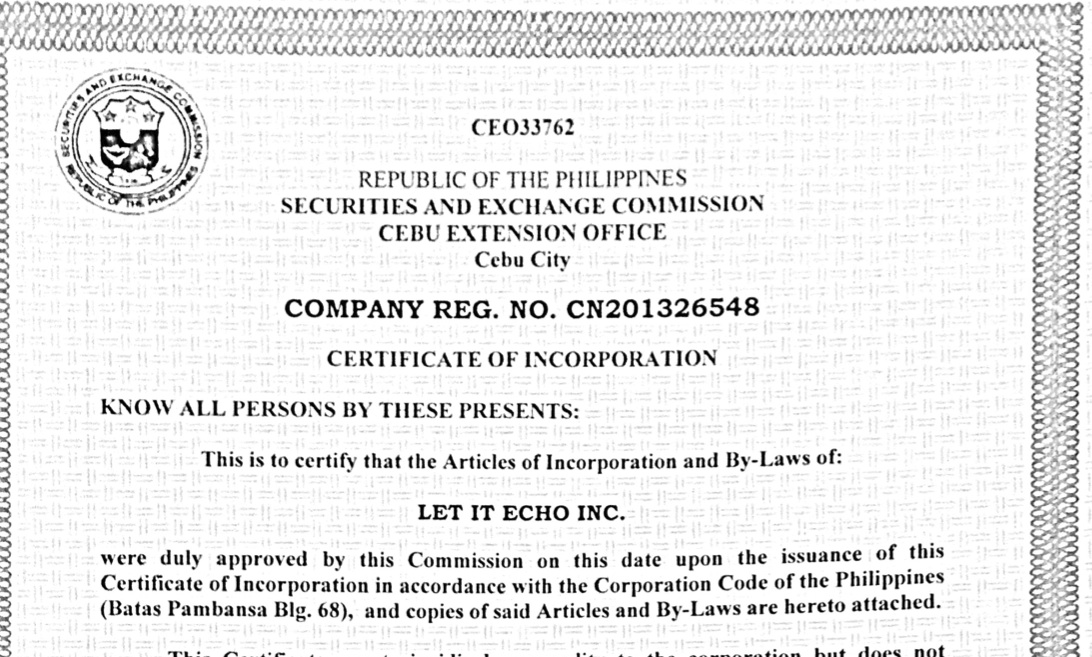 Earlier this month, Let It ECHO received the much-awaited good news from SEC. After months of going back and forth of signing papers, we are finally officially registered! We are very happy. We couldn't have done it without our good friend lawyer, Atty Maria Carmen Tormis-Abayon. Thank you for the help. Thank you, everyone, for the patience.