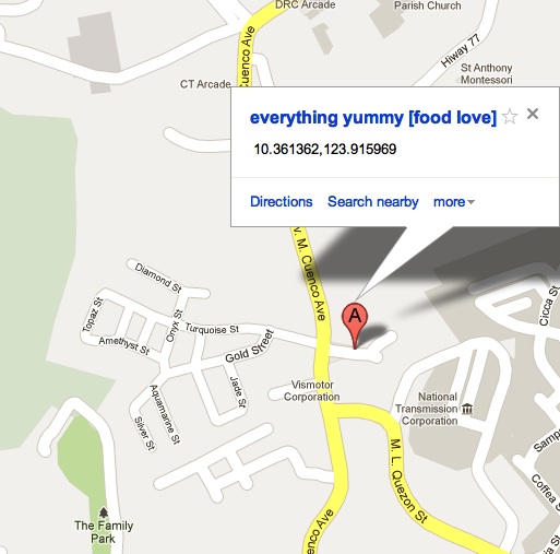 How to get there? You can refer to the map in the picture. everything yummy [food + love] is located at Piazza Elesia at Talamban. If you take the Banilad road, follow the road to Talamban. You will pass by University of San Carlos and Family Park. You will also pass by road to Cabancalan. Piazza Elesia is the building located at the right, right after the road to Cabancalan. Store opens Tuesdays to Saturdays 10:30am - 2:30pm and 5:30pm - 9pm.