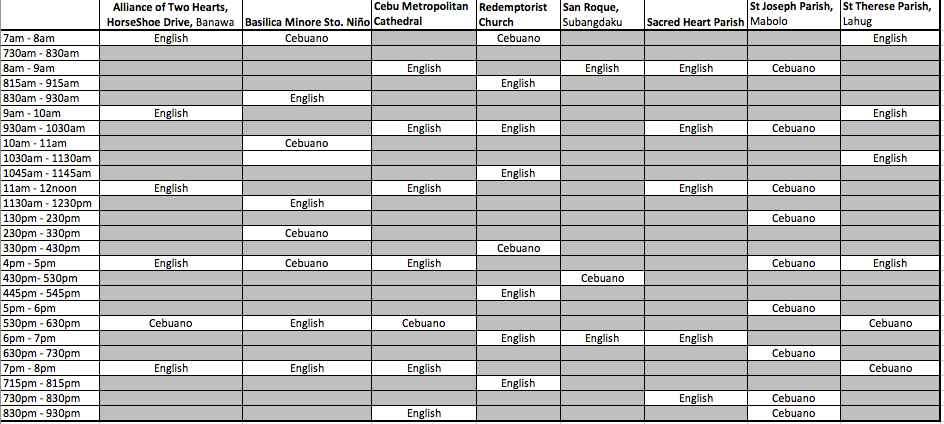 On Sundays, we are always in search of a church with a mass schedule that fits our schedule. So I compiled here the Sunday mass hours and churches near the city. This is for my easy reference. You may find this useful for you too. I got this from mass-schedules.com