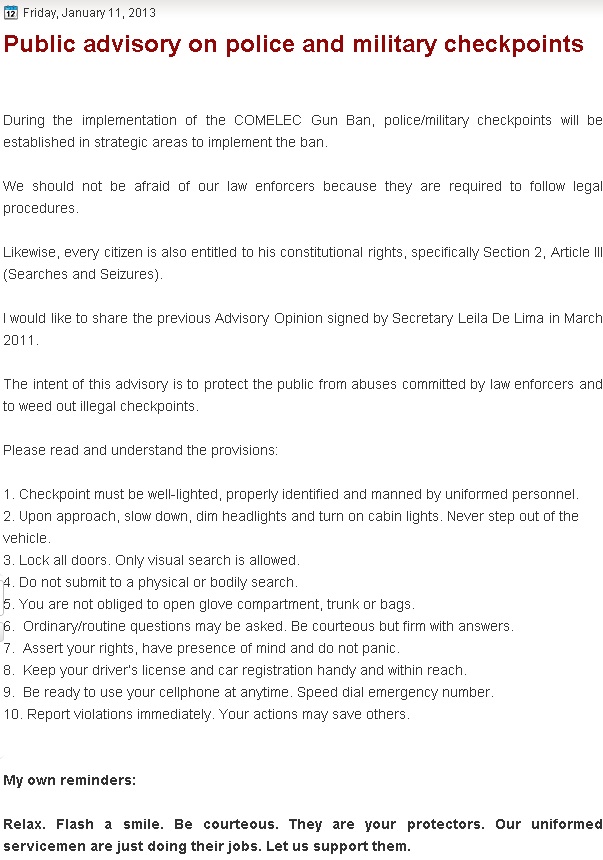 I received this email from our Security manager and thought it is a very useful information for everyone to know . Election is getting nearer and we are expecting several checkpoints. As a commuter, you have rights too. Know them. Ignorance excuses no one. Let's support our service men.