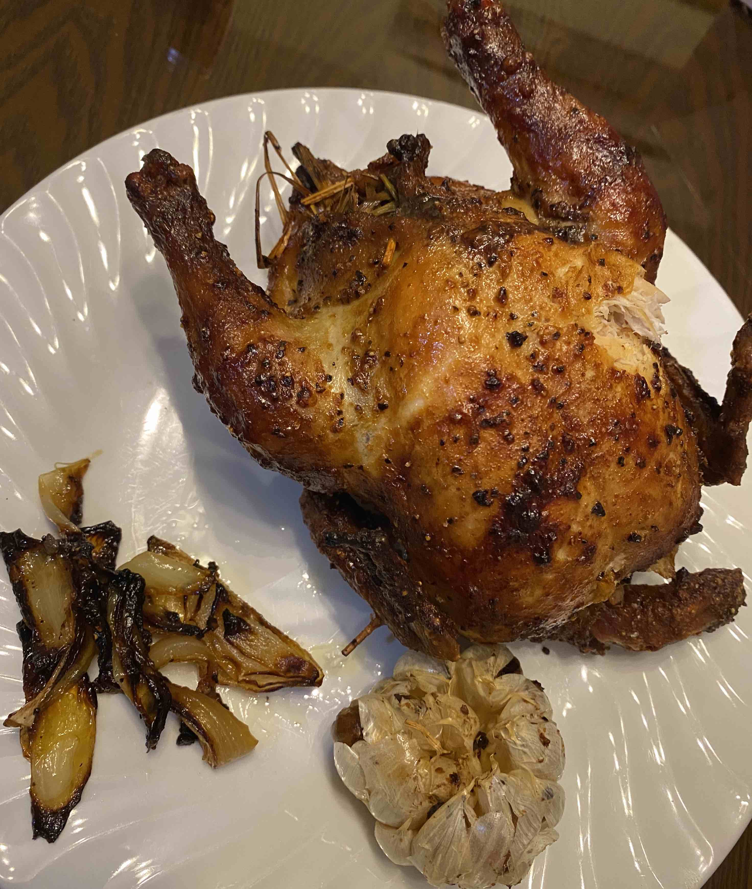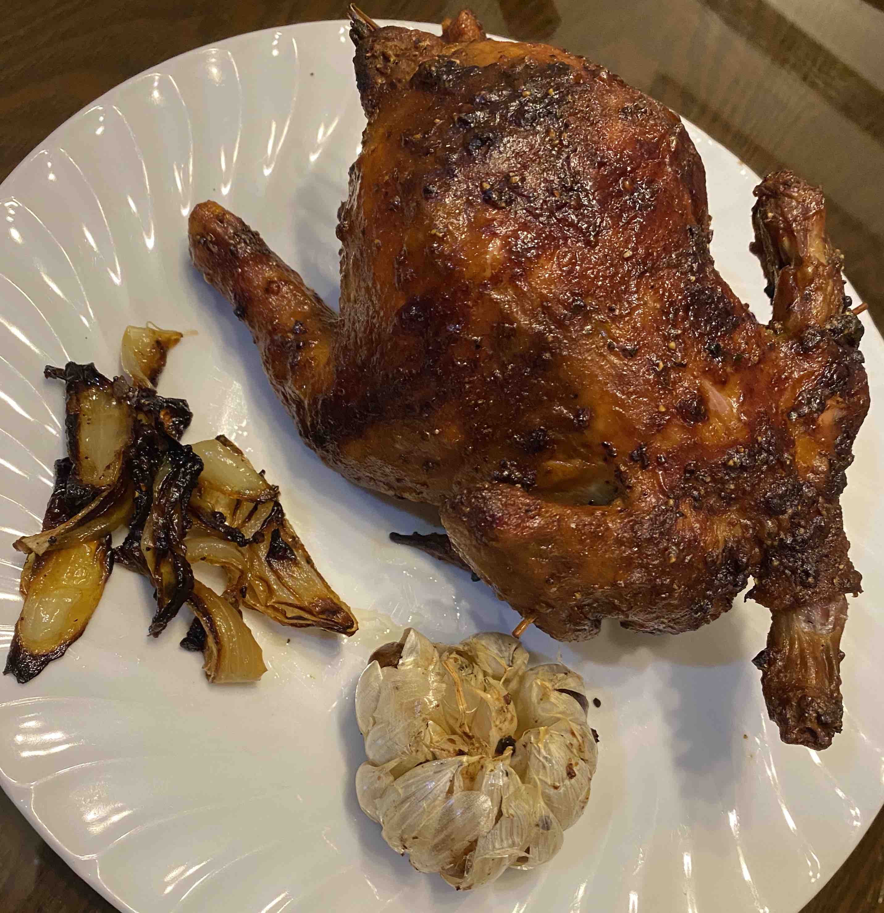 7. In the plan, placed chopped onions coated with olive oil. Put garlic. Make sure to position it so that it catches the chicken drips. Once cooking starts, check if the onions and garlic are browned. Get them before it charrs. This is your side dish.