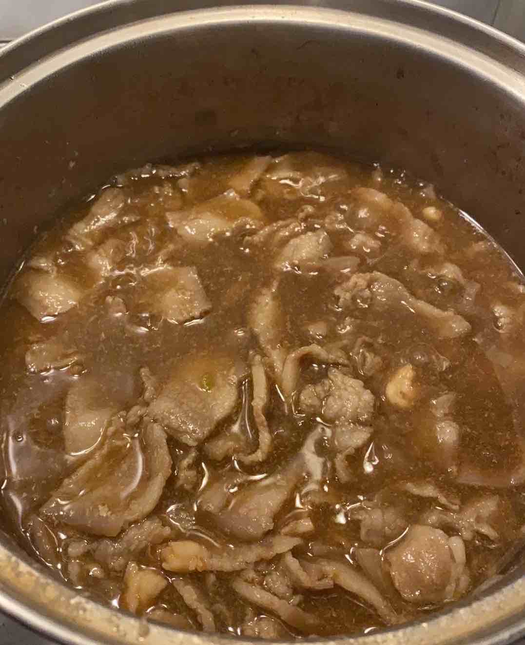 2. Saute garlic, onion then pork (not include marinade sauce). Add 3 cups water then simmer until pork is tender. Add marinade sauce.