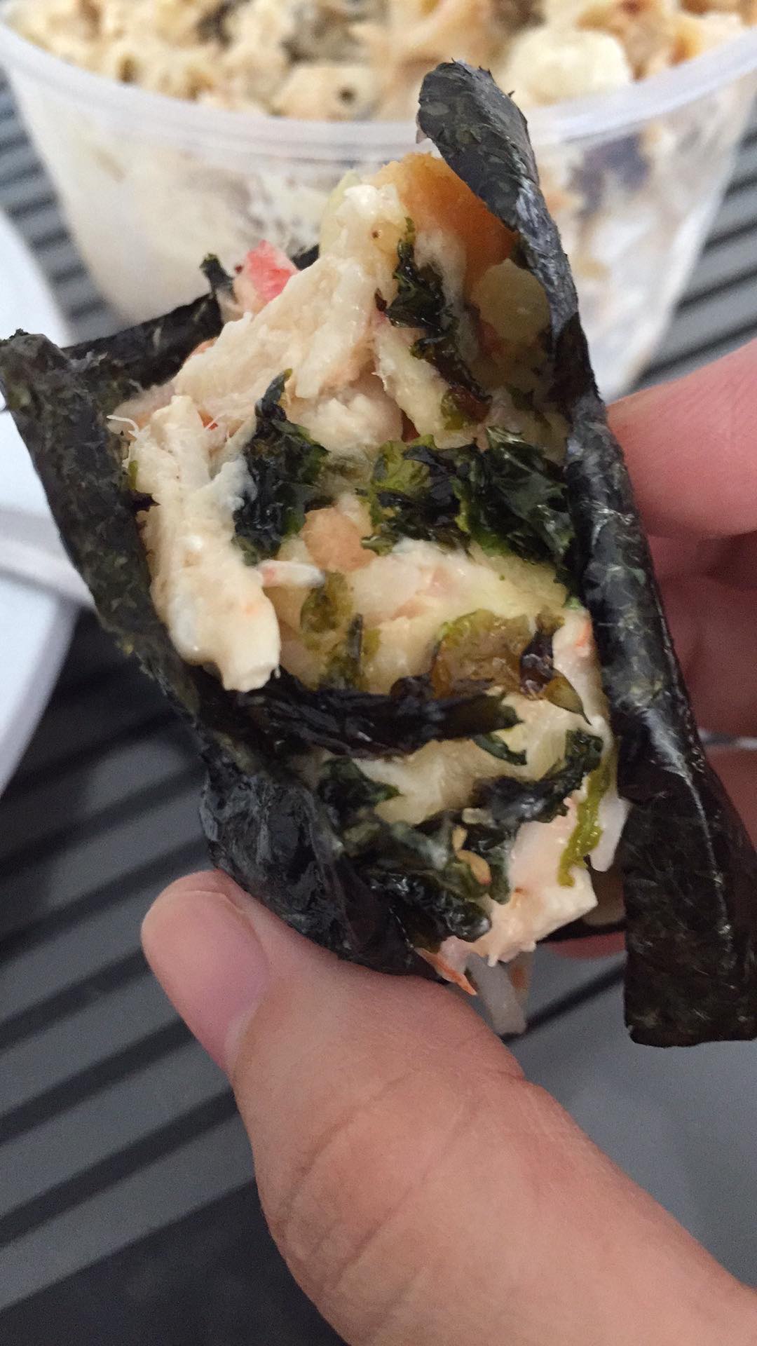 1. In a bowl, pour Kani, salmon, onion leaves, white onions, cream cheese, mayonnaisse. Mix thoroughly. Add in sriracha or wasabi, according to how spicy you want it to be. Just 1tbsp of wasabi is enough for me.
